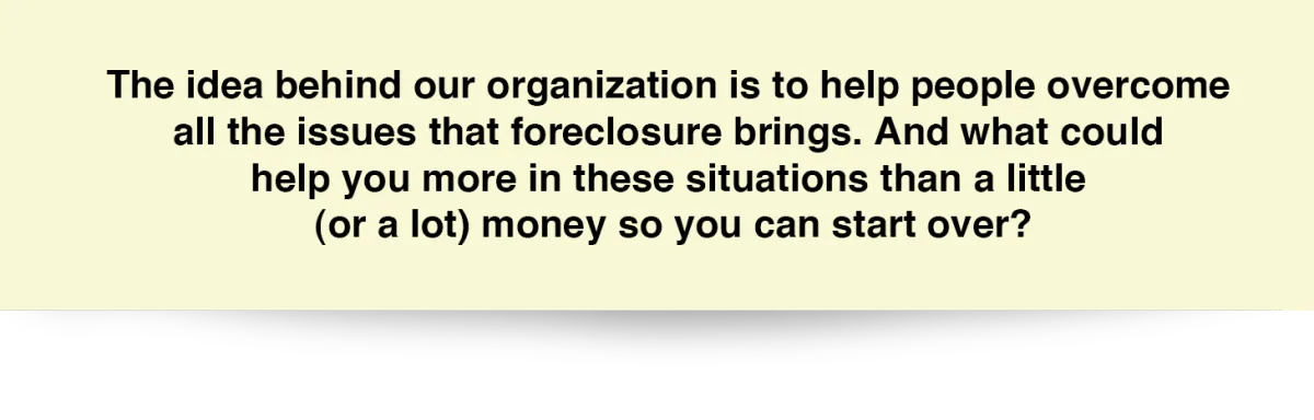 Our whole existence is dedicated to people like you! You didn’t deserve to lose your home… Let us, at least, help you have some money back, so you can start all over again… You deserve this chance! And there’s no risk...
